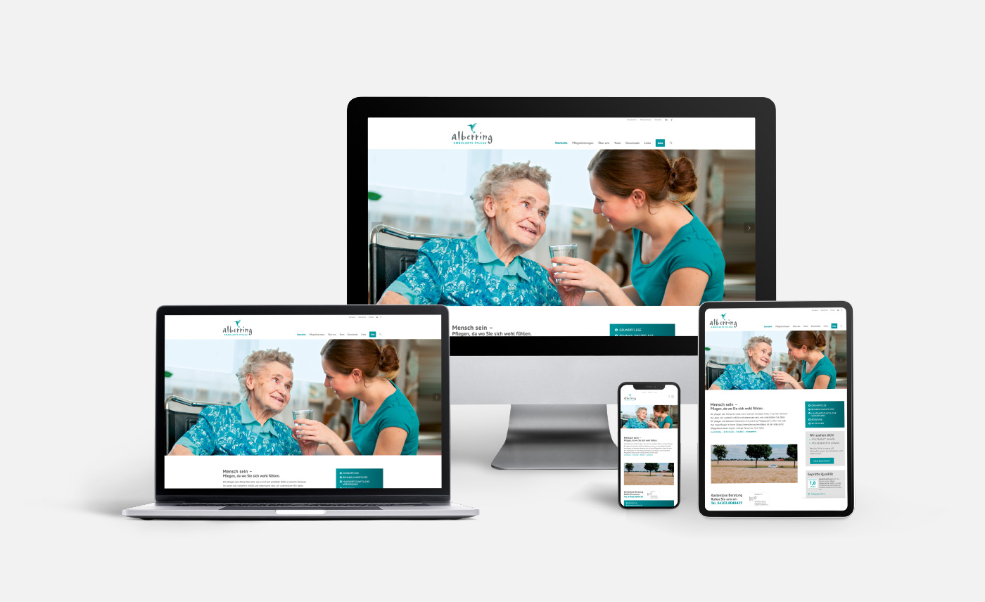 Das Corporate Design von Alberring Ambulante Pflege steht für Menschlichkeit, Vertrauen und professionelle Fürsorge. Im Mittelpunkt steht der Mensch – begleitet mit Respekt, Wärme und fachlicher Kompetenz.