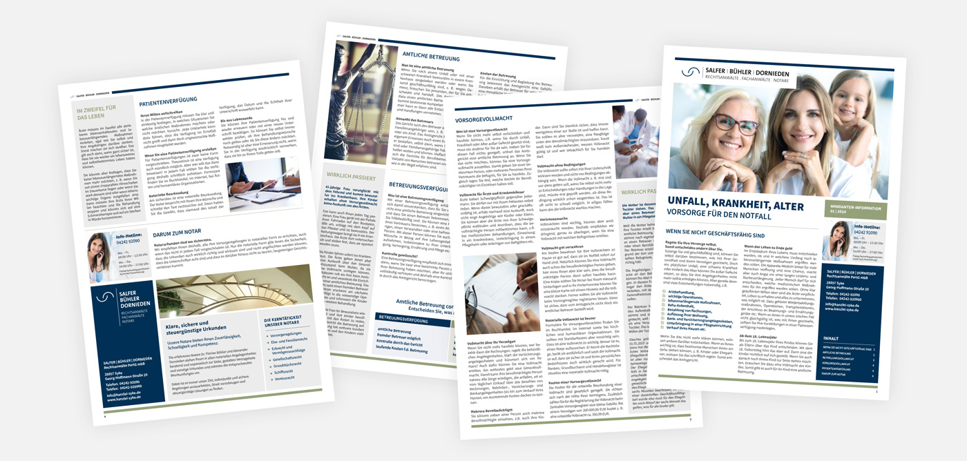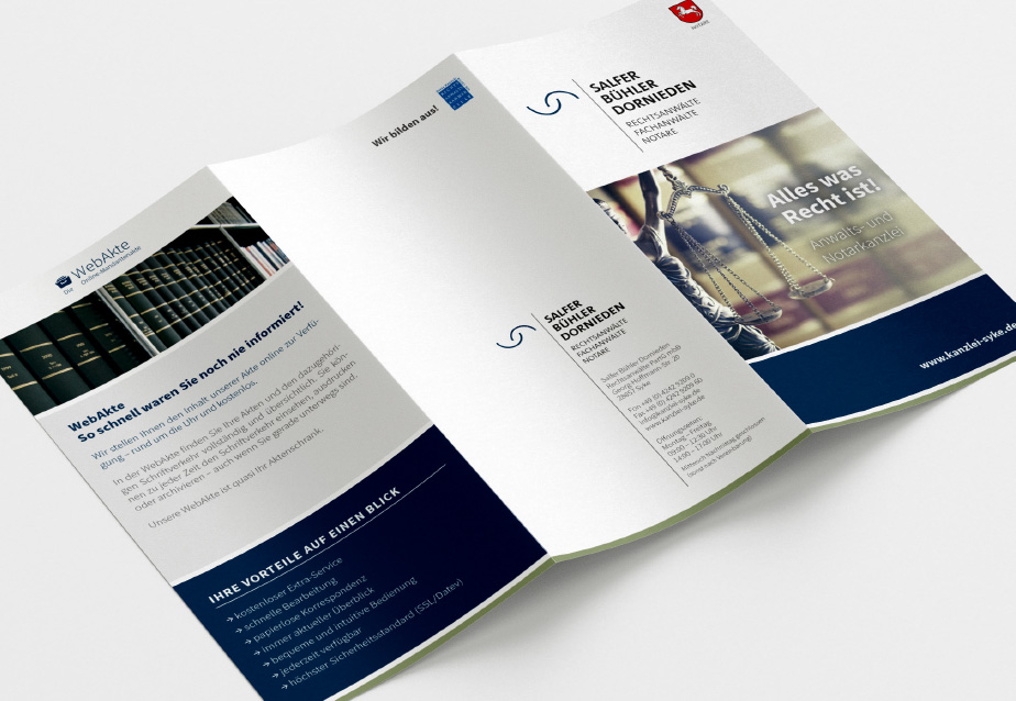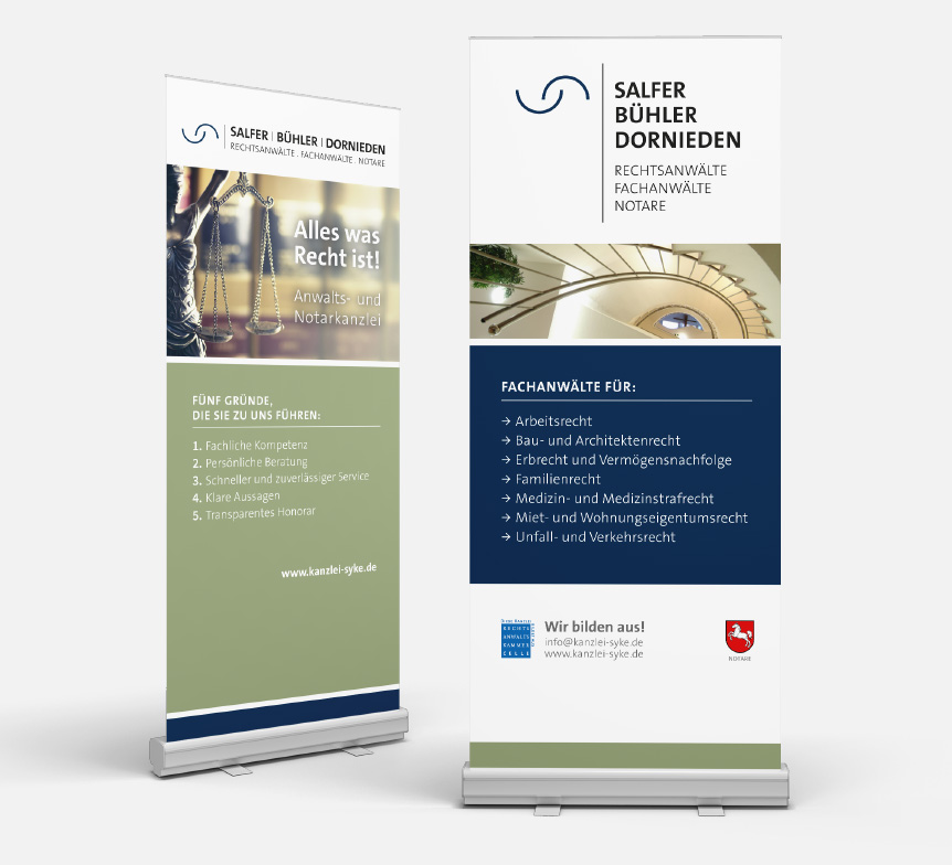 Für die Kanzlei Salfer · Bühler · Dornieden Rechtsanwälte und Notare in Syke haben wir ein neues Corporate Design entwickelt, das Seriosität, Kompetenz und Klarheit setzt – Werte, die in der juristischen Beratung und notarielle Tätigkeit zentral sind. Die Gestaltung verbindet sachliche Präzision mit einer zeitgemäßen visuellen Sprache, die der Vielfalt der Tätigkeitsfelder genauso gerecht wird wie dem professionellen Anspruch der Sozietät.